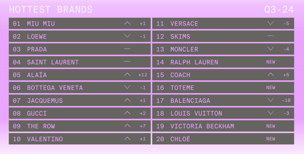 Miu Miu’s rise to the top is a masterclass in how embracing heritage pays off in the long run. While the micro-mini skirt from Spring 2022 set the internet ablaze, the brand didn’t stop there—it stayed true to its quirky, intellectual roots, proving that authenticity has staying power. Even after the viral moment faded, Miu Miu maintained its momentum, holding its position as the hottest brand in fashion according to Lyst’s Q3 2024 report. The secret? Embracing it’s brand identity and heritage.