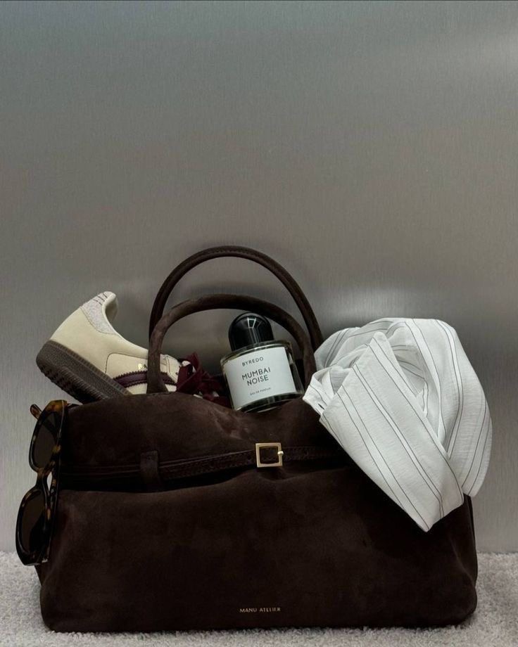 The rise of mocha brown began well before its official title as 2025’s Color of the Year. In 2024, the fashion industry embraced this hue across collections, accessories, and campaigns. Notable brands like DeMellier and Manu Atelier led the charge with their brown suede handbags. DeMellier’s New York Tote in mocha suede became a social media darling, frequently featured in TikTok styling videos and Pinterest boards dedicated to “quiet luxury.” Similarly, Manu Atelier’s Le Cambon 35 tote in chocolate suede saw sell-out success, driven by its appearance in influencer content and flat-lay aesthetics.